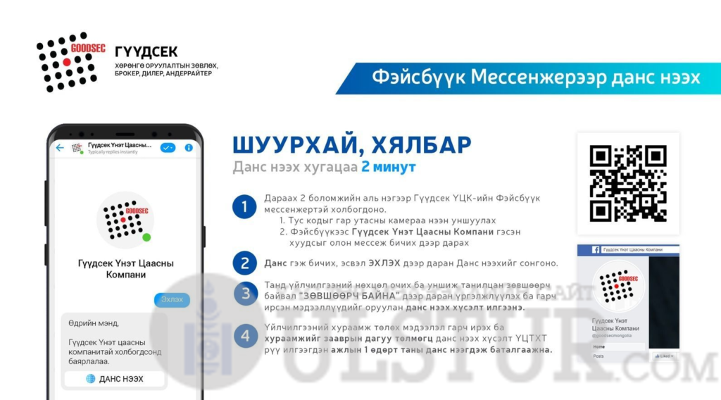 Дансаа нээлгэж амжаагүй иргэдэд Фэйсбүүк мессенжерээр данс нээх үйлчилгээг Гүүдсек Үнэт цаасны компани нэвтрүүллээ. Та дансаа нээх бол Гүүдсек Үнэт Цаасны Компанийн фэйсбүүк хуудас руу мессеж илгээх эсвэл m.me/goodsecmongolia хаяг дээр дарж Данс гэж бичихэд хангалттай.