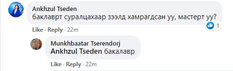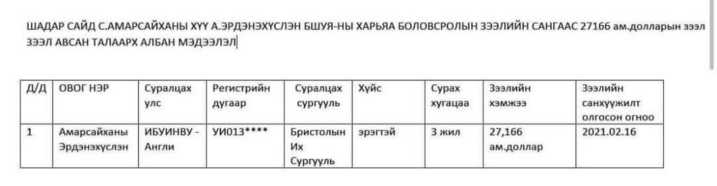 Харин түүний сургалтын зээлд хамрагдах хүсэлтэд нь БШУЯ-ны харьяа Боловсролын зээлийн сан “үгүй” гэж хэлжээ. Учир нь “баклаврын зэрэгт суралцагсдад зээл гаргахгүй байгаа” гэх хариултыг хэлсэн байна.