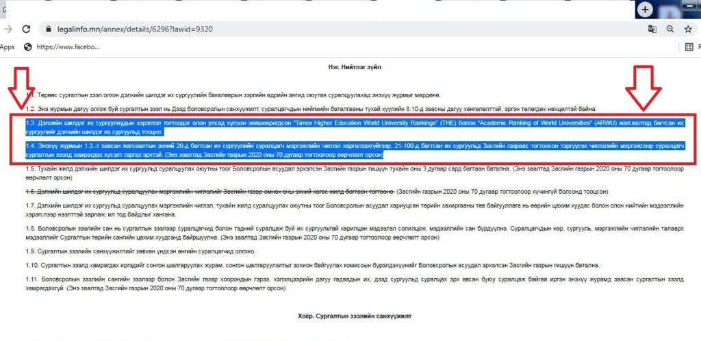 МУ-ын Засгийн газар дэлхийн топ их сургуулиудын жагсаалтын эхний 20 сургуульд тэнцсэн суралцагчид мэргэжлийн чиглэл харгалзахгүйгээр, харин 21-100 жагсалтанд багтах Их сургуульд тэнцсэн суралцагч нарт Засгийн газраас тогтоосон “Тэргүүлэх чиглэлийн мэргэжил”-ээр суралцах бол сургалтын зээлд хамрагдах хүсэлт гаргах эрхтэйг тогтоосон байдаг.