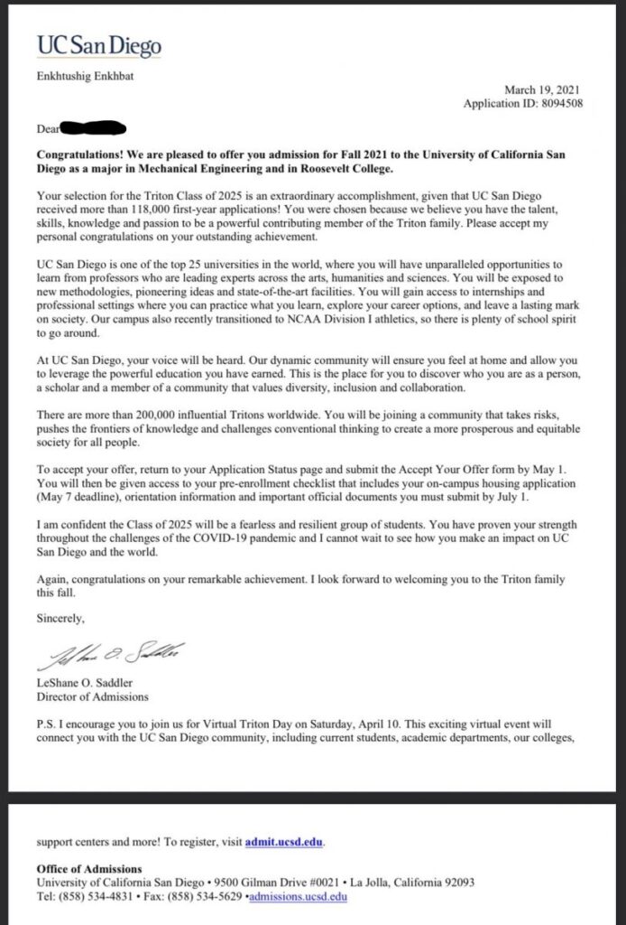Э хүү нийслэлийн мэдээлэлзүйн олимпиадын удаа дараагийн тэргүүн байрын шагналтан. TOEFL 107, SAT 1520 оноотой. Калифорнод байх Сандеогогийн их сургуулийн шалгуур үзүүлэлтийг сурлагын чанар, мэдлэг чадвараар ханган, суралцах урилга хүлээн авсан. Түүнд урилга ирүүлсэн Сандеогогийн их сургууль дэлхийн ТОП 100 сургуулийн 33-т эрэмбэлэгддэг. Өөрөөр хэлбэл, шадар сайдын хүүгийн суралцах сургуулиас даруй 58 байрын өмнө эрэмбэлэгддэг сургууль болохыг та баримтаас харж байна.