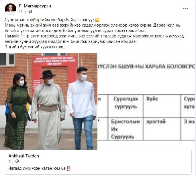 Бас нэгэн охины жишээ: “Сургалтын төлбөр ийм хялбар байдаг гэж үү? Намайг 11-р анги төгсөхөд ээж минь энэ зээлийн талаар судалж мэргэжилтнээс нь асуухад “энгийн хүний хүүхдэд олддог юм биш” гэж хариулж байсан юм даа. Энгийн бус хүний хүүхдээ гэж” хэмээн бичжээ. Баримт өөрөө яриг…