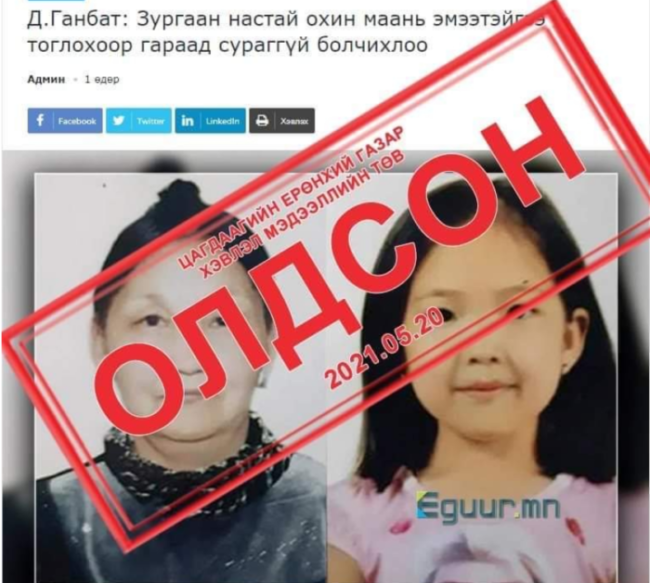 Энэ сарын 17-ны өдөр зургаан настай охин, эмээгийн хамт гэрээсээ гараад, сураггүй болсон талаар ар гэрийнхэн нь мэдээлж, цагдаагийн алба хаагчид хайж байсан юм. Тэгвэл тэднийг баянзүрх дүүргийн 27 дугаар хорооны нутаг дэвсгэрт байрлах нийтийн байрнаас өнөөдөр 16:55 цагт олдсон байна. Тодруулбал Баянзүрх дүүрэг дэх цагдаагын газрын гуравдугаар хэлтсийн Эрүүгийн цагдаагийн тасгийн алба хаагчид эсэн мэнд олж тогсоосон байна.